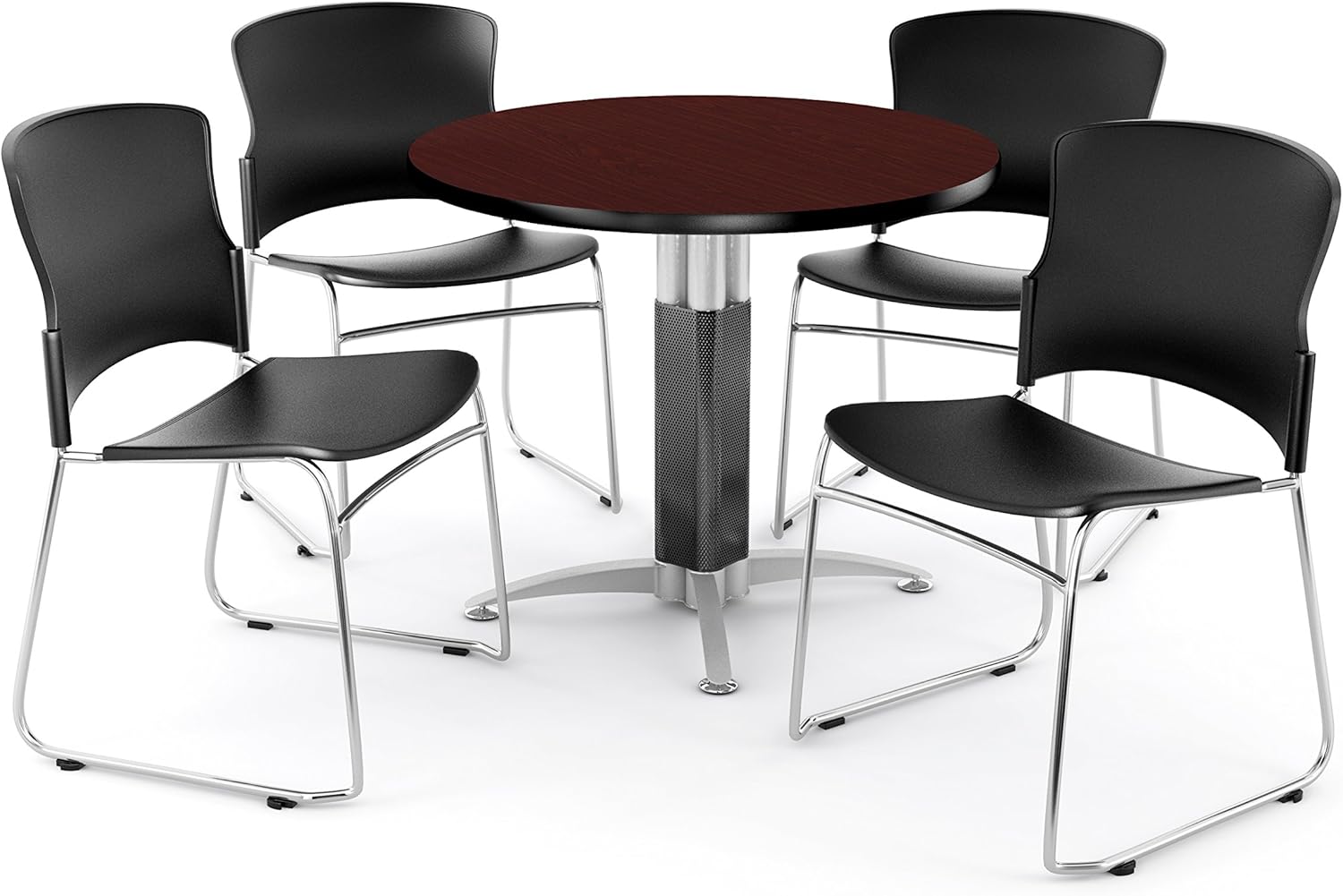 OFM Core Collection Breakroom Bundle, 36" Round Metal Mesh Base Multi-Purpose Table in Mahogany, 4 Multi-use Plastic Stack Chairs in Black (PKG-BRK-027-0010)