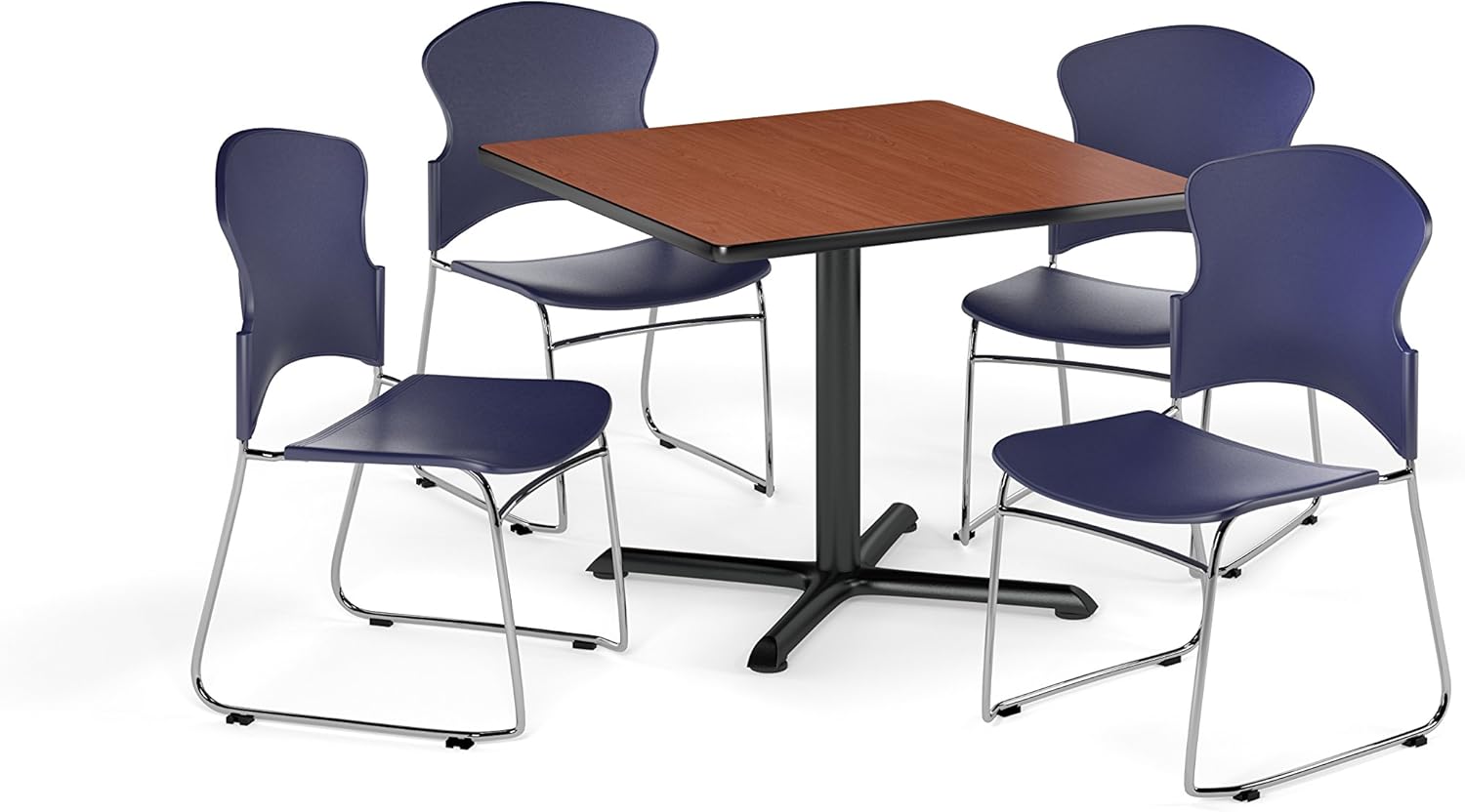OFM Core Collection Breakroom Set, 36" Square Multi-Purpose Table in Cherry, 4 Multi-use Plastic Stack Chairs in Navy (PKG-BRK-034-0004)