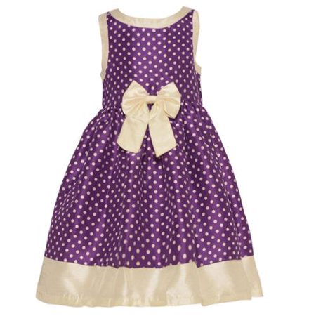 Purple and cream Shantung dress from Mia Juliana just for your little lady. The gown features tiny polka dots and cream edging, matching the ribbon tie attached at the waist leading to a flared skirt. Back zipper closure for an easy dressing.