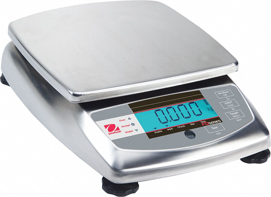 Packaging/Portioning Scale, Digital, Capacity 3kg/6 lb., Graduations 0.001kg/1g/0.002 lb., Backlit LCD, (3) LED Indicator Display, Weighing Surface Depth 8-1/4 In., Weighing Surface Width 8-1/4 In., Overall Length 9 In., Overall Width 12 In., Overall Height 2-4/5 In., Power Unit 9VDC, 0.5A AC Wall Adapter 100-120 VAC, 50/60 HzPlatform Material Stainless Steel, Housing Material Stainless Steel RestrictionsThis item has been restricted from sale in the following states: [PR] Digital Packaging/Portioning Scales-Dry UseNSF Listed and USDA/AMA AcceptedFD SeriesChemical-resistant construction. Simple 1-key checkweigh target entry, lockout menu secures against unwanted changes. Fast electronics and optimized load cell improve productivity. Perform percent and checkweighing and weigh in lb., decimal and fractional 1/4 oz., lb.:oz., kg, g. Include bright backlit LCD and 120-hr. rechargeable battery.NTEP legal-for-trade certified and meets HACCP conformity.