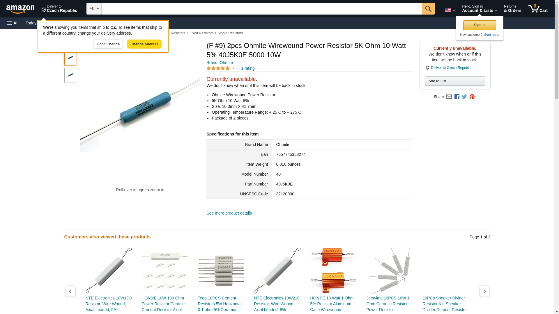 | Feature | Price For: Each Product Range: OHMITE - 40 Series Resistance: 5kohm Power Rating: 10W Resistance Tolerance: \xb1 5% Resistor Case Style: Axial Leaded Resistor Element Type: Ceramic Temperature Coefficient: \xb1 20ppm/\xb0C RoHS Compliant: Yes |