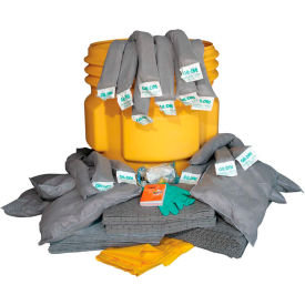- <b>Price For:</b> Each <b>Container Type</b>: Drum <b>Color</b>: Yellow <b>Item</b>: Spill Kit <b>Volume Absorbed Per Pkg.</b>: 52 gal. <b>Item - Spill Control</b>: Spill Kit/Station <b>Includes</b>: (20) 48" Universal Socks, (6) Universal Pillows, (100) Universal Bonded Pads, (1) 65 gal. Overpack, (6) Disposal Bags with Ties, (1) Pair Gloves, (1) Pair Goggles, (1) Emergency Response Guidebook <b>Volume Absorbed Range</b>: 50+ gal. <b>Fluids Absorbed</b>: Universal