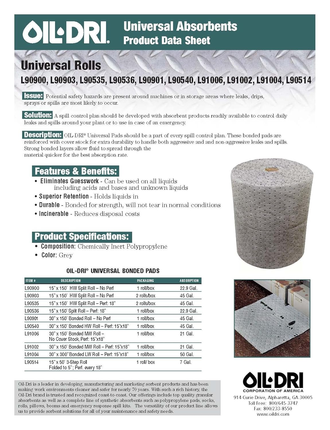 | Feature | This light weight roll is made of universal polypropylene layers with bonded coverstock, perfect for general-purpose clean up of aggressive and non-aggressive leaks and spills |