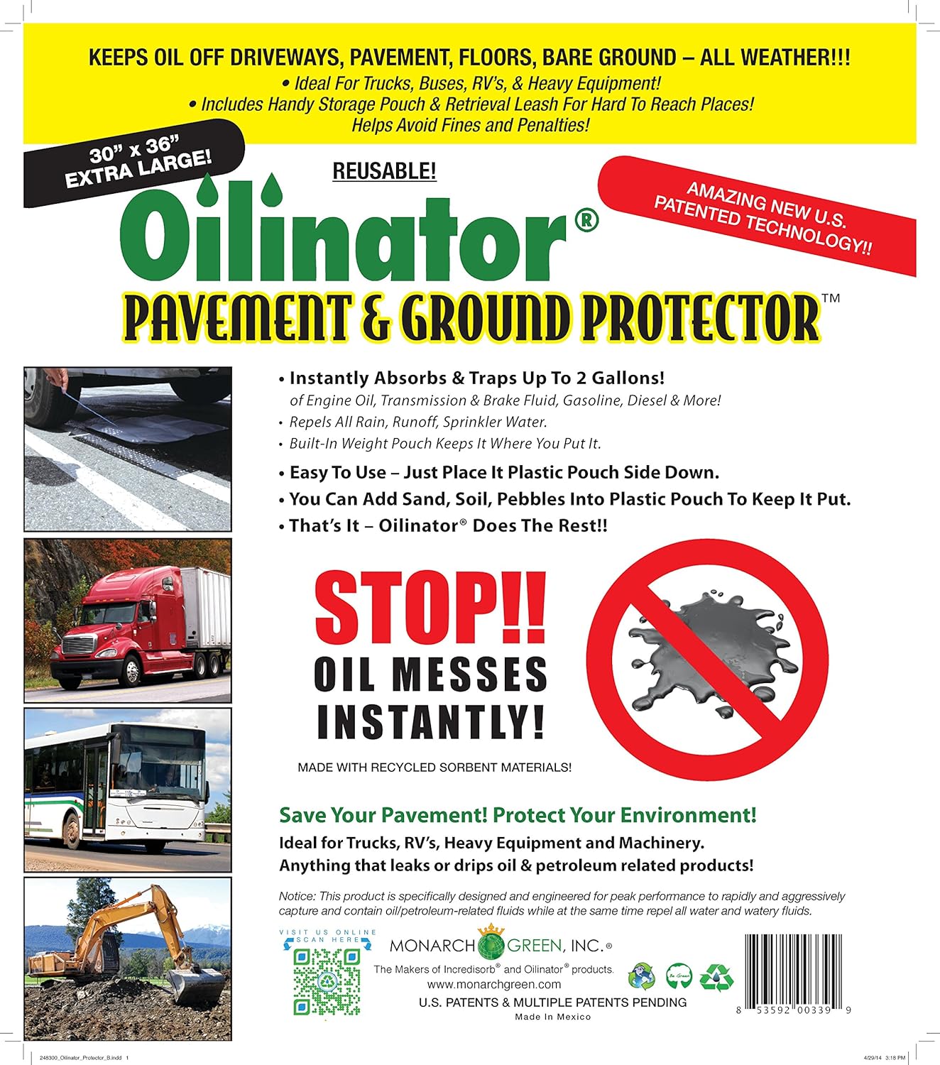 Monarch Green Oilinator Protector is so unique it employs proprietary Monarch Green patented technology plus multiple additional patents pending. It is an ultra-high capacity all-weather mat which will absorb 2 Gal. of petroleum based fluids utilizing 3 layers of fast-acting, high capacity proprietary materials that absolutely love oil and repel water 100%. The bottom of the Protector is made from heavy duty plastic sheeting that acts as a final barrier of protection to stop any stray oil from staining flooring, driveways or the surrounding area and it is also designed with an opening at one end so that any weighted material (gravel, sand etc.) can be placed inside to keep it in place in windy or rainy weather.