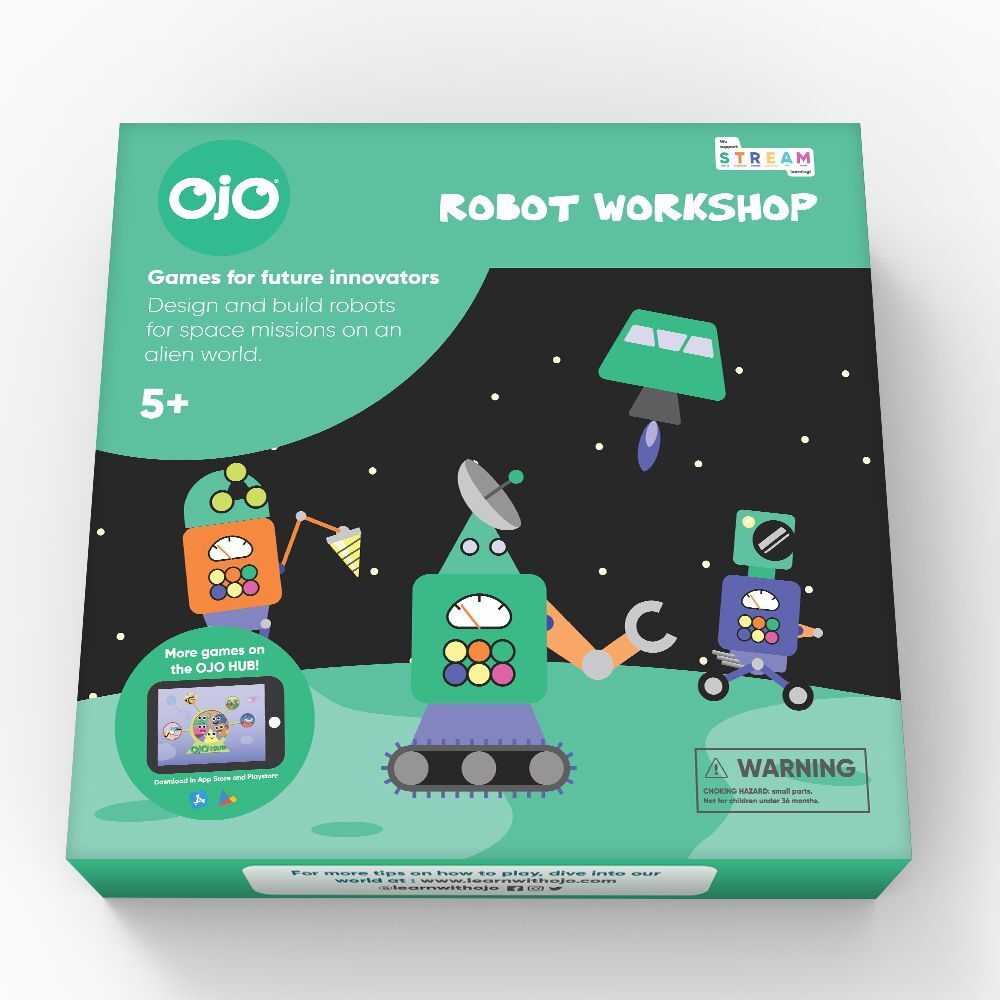 ROBOT WORKSHOP robotics board game is made by OjO, a pioneering educational STEM toy company for future innovators! We make problem-solving games based around real-world problems that stimulate children's curiosity, creativity and critical thinking skills, brought to life by our family of characters, playful narrative and colourful design. Your child can learn STREAM topics with our learning toys for kids. SCIENCE, TECHNOLOGY, ROBOTICS, EDUCATION, ARTS, MATHS