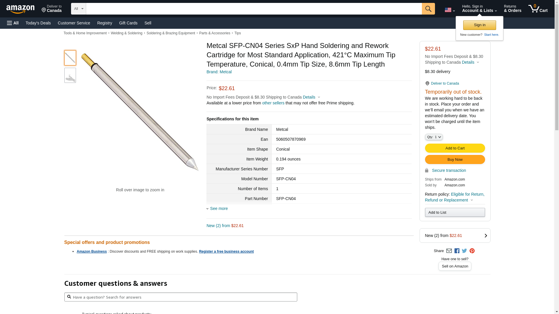 Metcal SFP-CN04 Series SxP Hand Soldering and Rework Cartridge for Most Standard Application, 421°C Maximum Tip Temperature, Conical, 0.4mm Tip Size, 8.6mm Tip Length