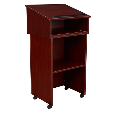 The versatile combo 22/112 mobile full floor lectern from Oklahoma Sound features stain and scratch-resistant thermofused melamine laminate secured to a strong particleboard core. It is ideal for supporting presentation equipment like projectors. The sturdy cabinetry Includes a shelf with ample storage space and four easy-roll casters (two locking.)<br/><br/>Features :<br/><br/>- Material: High pressure thermal-fused laminate on a particleboard core<br/>- Finish: Mahogany<br/>- Full floor lectern comprised of #22 and #112 OS products<br/>- Features a paper/book stop<br/>- Use as an A/V cart for presentation equipment.<br/><br/>Specifications :<br/><br/>- Product Dimensions : 47.5"H x 23.75"W x 19.88"D<br/>- Product Weight : 81 lbs.