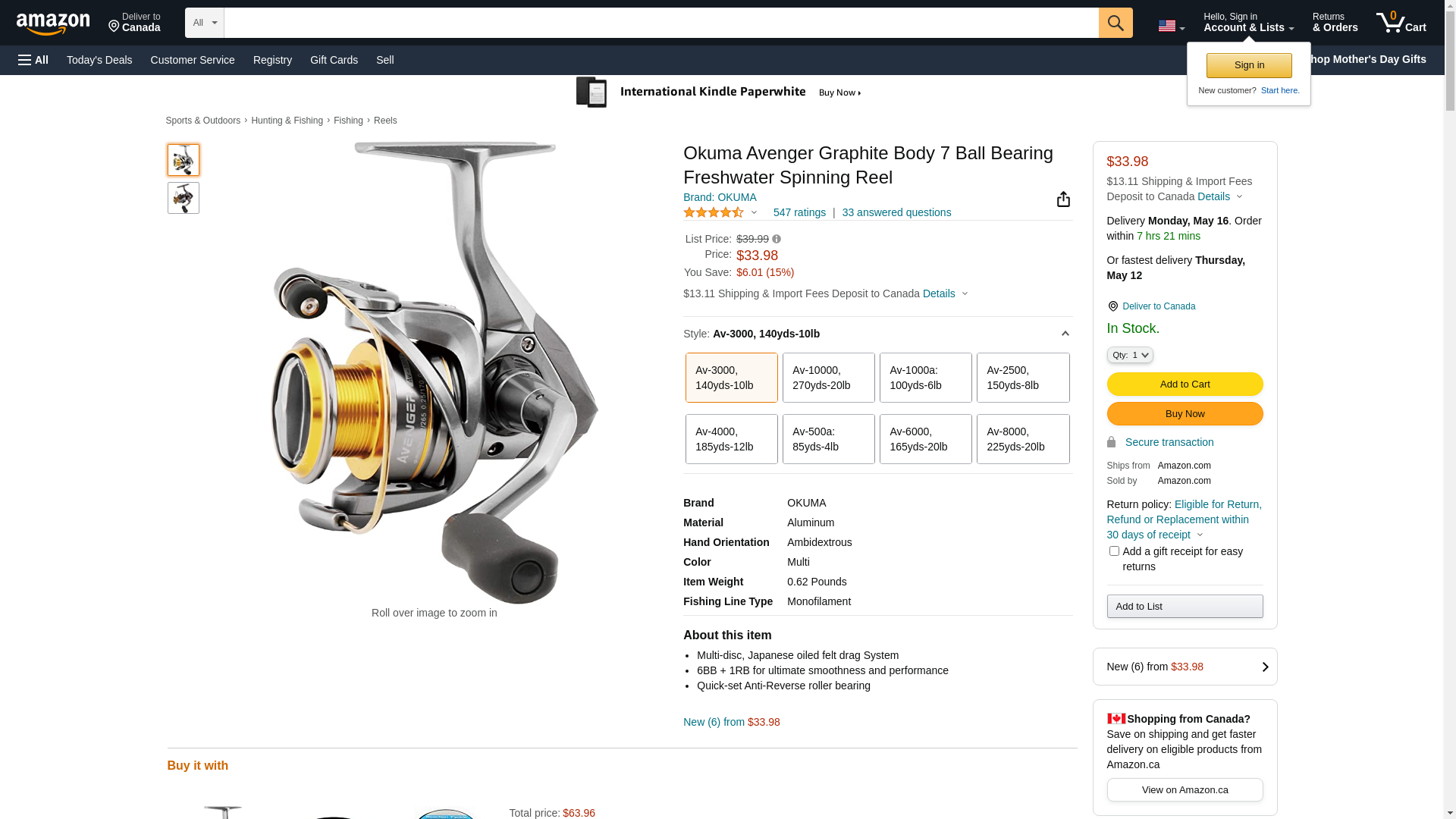 Okuma Avenger New Generation AV-3000 5.0:1 Gear Ratio 7 Bearings 25.80" Retrieve Rate Spinning Reel,Multi