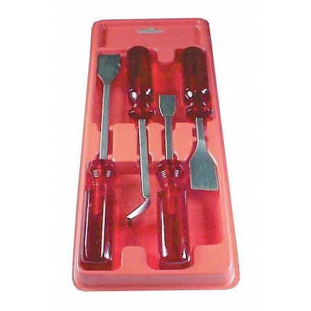 Old Forge 7365 Features and Benefits: -The Scraper blades are heat treated alloy steel and machined for best cleaning with minimum effort . -The finish is durable black oxide with sturdy, durable plastic handles . -The Scraper Set is packed in a red, hanging, and impact resistant plastic tray. -4 Piece Carbon Scraper Set .-Lifetime warranty does not cover abuse.