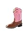 A classic cowgirl boot for her, updated with a bubblegum pink shaft This kicky little boot features a lightly distressed tan corona calfskin leather foot under a fancy stitched pink leather shaft. Hand corded toe medallion. Square toe and low block heel. Double stitched Goodyear leather welt.