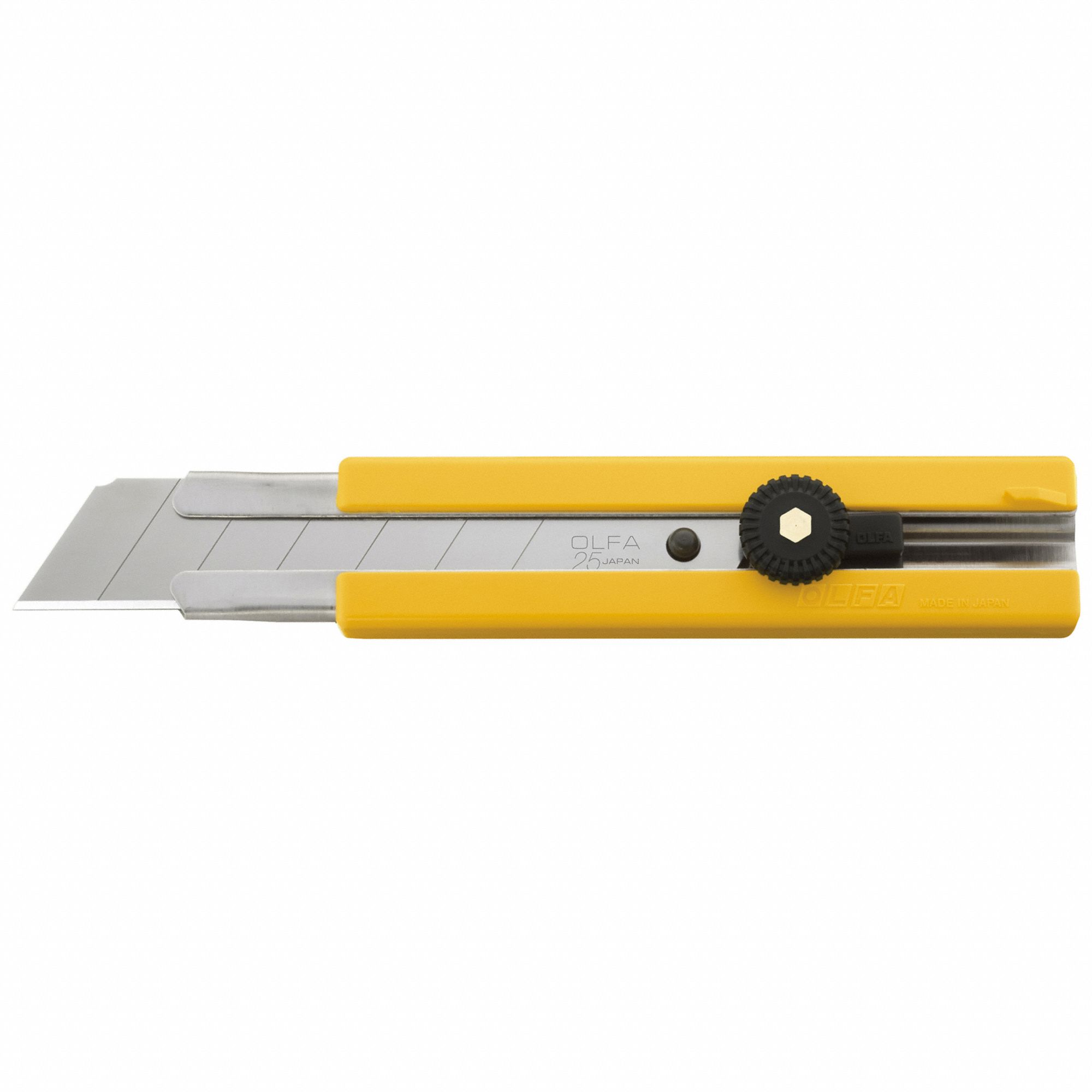 Snap-Off Utility Knife, Blade Width 25 mm, Extra Heavy Duty, Blade Material Carbon Steel, Blade Change Slide Open, Number of Blades Included 1, Number of Segments 7, Overall Length 6 3/4 in, Overall Width 3/4 in, Overall Thickness 1/2 in, Handle Color Yellow, Handle Type Cushion Grip, Handle Material ABS/PVC, Stores No Storage, Application For Cutting Leather, Rubber, Cardboard, Rope, Paper, Carpet, Fiberglass, Acetates, Linoleum, Plastic, Features Ratchet Wheel Blade Lock