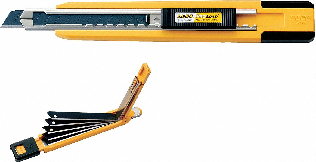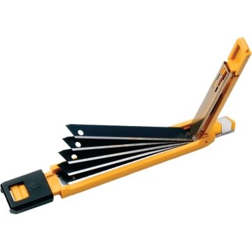| Feature | Price For: Each Blade Material: Carbon Steel Features: Auto Lock, Self-Loading, Pocket Clip, Built-In Blade Snapper Stores: (5) Blades Application: For Cutting Wallpaper, Window Films, Caulking, Art & Craft Applications Item: Snap-Off Utility Knife Overall Length: 5-1/2" Overall Width: 7/8" Overall Thickness: 5/8" Blade Change: Automatic Number of Segments: 13 |