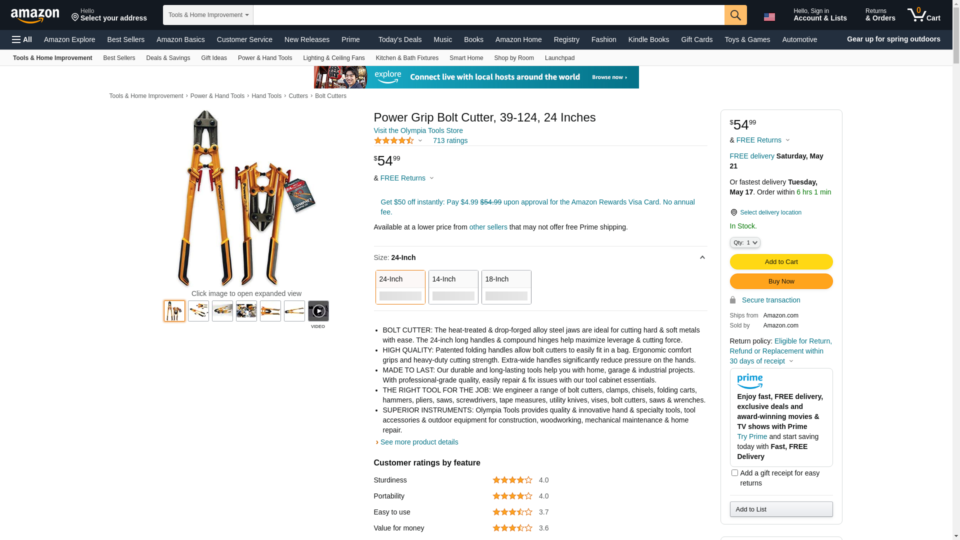 OLYMPIA Tools is a widely recognized brand of hardware products designed for True Professionals who takes their tools seriously. Each piece is made to exacting tolerances and tested to ensure that it meets and exceeds industry standards so that it meet your needs on the jobsite, shop or on home projects. OLYMPIA goes all out to bring award winning innovation and quality to each product: the appearance, fit and finish of every OLYMPIA product will make you proud you own the very best. The 24 in. Powergrip Bolt Cutter features patented folding handles that allow bolt cutters to be stored or transported easily. The extra-wide handles reduce pressure on the hands when cutting through thicker bolts.