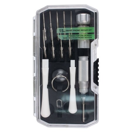 - POCKET SIZED TOOLKIT: 15 piece repair toolkit includes screwdriver, suction cup, pry bar, storage box & more. Easy-grip handle has free-spinning end cap for constant finger pressure.