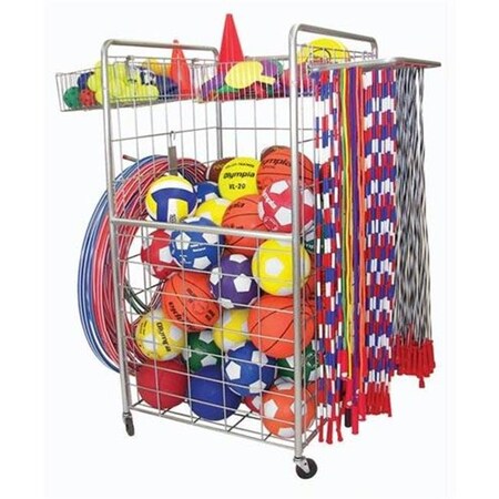 <p>The perfect cart for all your PE and storage transporting. Simply roll into your storage area or into the gym and you are ready for class. Four large deluxe EZ-Roll 4" castors. Features large 50 ball storage cage, two 24"L x 12"W X 4" deep wire baskets for small item storage, jump rope rack that will hold up to 120 ropes and a hoop rack for up to 48 hoops. Cart measures 60"H x 33"D x 31"W. 54"W baskets and racks attached. Freight 94 lbs.</p>