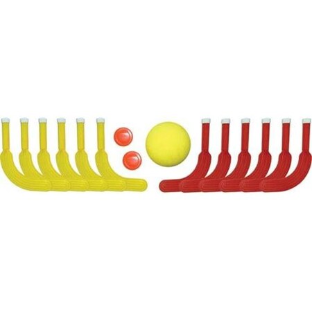For exciting play on scooters with special 11" hockey sticks with vinyl hand grip. Set contains 6 Red and 6 Yellow sticks, 6" foam ball, and 2 play pucks.