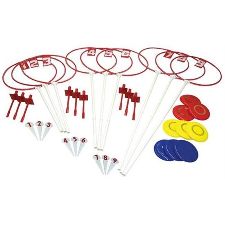 The portable lightweight target hoops are made of durable PVC and plastic. Versatile targets are available in three heights and can be set up as a disc golf game, 9-hole course, target hoops, obstacles, etc. The 9 target outdoor set includes 9 ea. numbered targets (3 ea. 40 center height, 3 ea. 52 center height, 3 ea. 64 center height), 9 ea. 90G discs, 9 ea. numbered tees and 9 ea. steel ground sockets. Some assembly required.