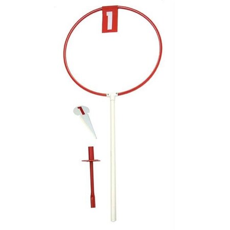 "The portable lightweight target hoops are made of durable PVC and plastic. Versatile targets are available in three heights and can be set up as a disc golf game, 9-hole course, target hoops, obstacles, etc. The 9 target outdoor set includes 9 ea. numbered targets (3 ea. 40"" center height, 3 ea. 52"" center height, 3 ea. 64"" center height), 9 ea. 90G discs, 9 ea. 10"" numbered ""tees"" and 9 ea. steel ground sockets. Individual targets are also available. Some assembly required. UPS."