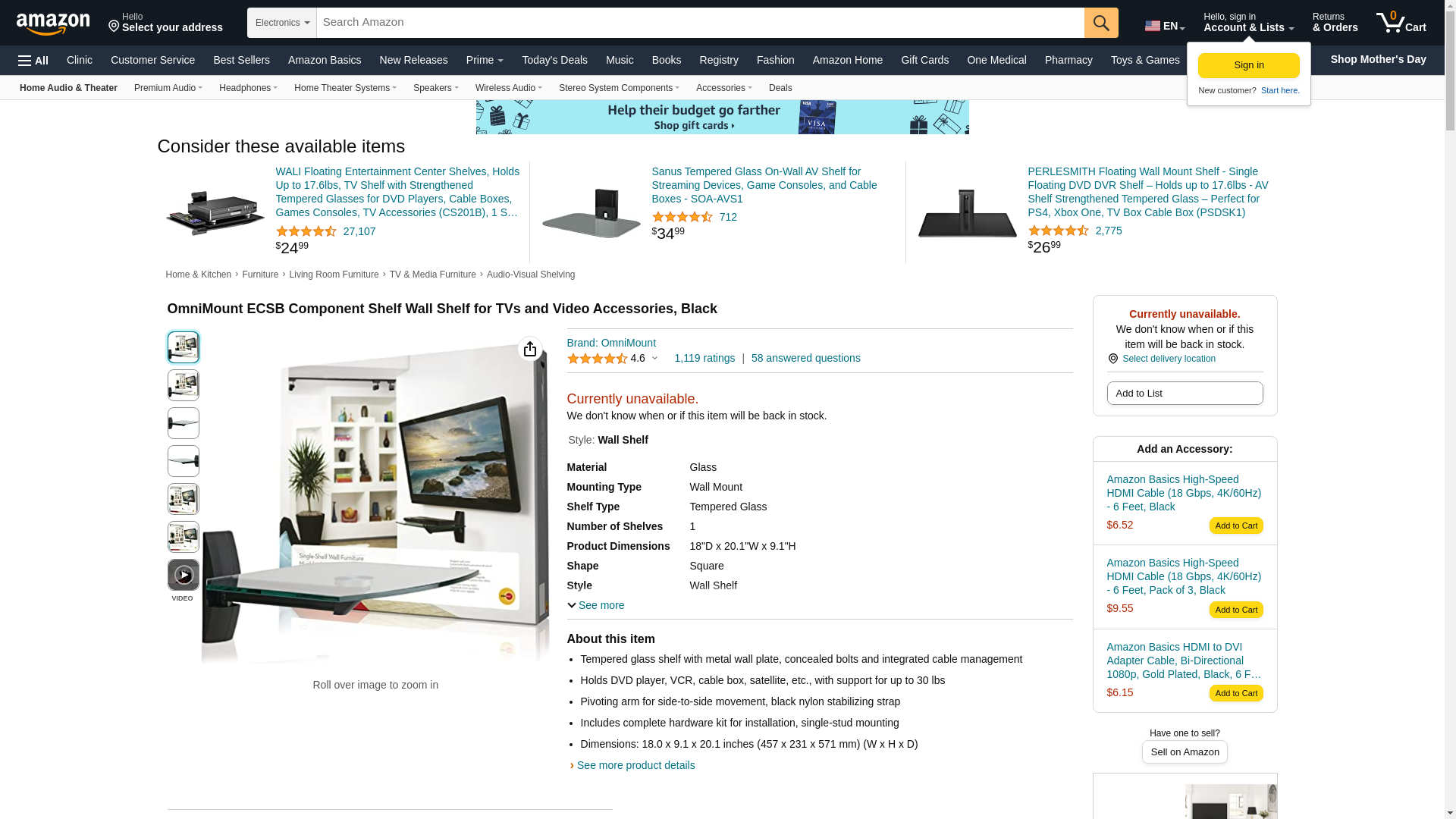 OmniMount ECSB Component Shelf Wall Shelf for TVs and Video Accessories, Black