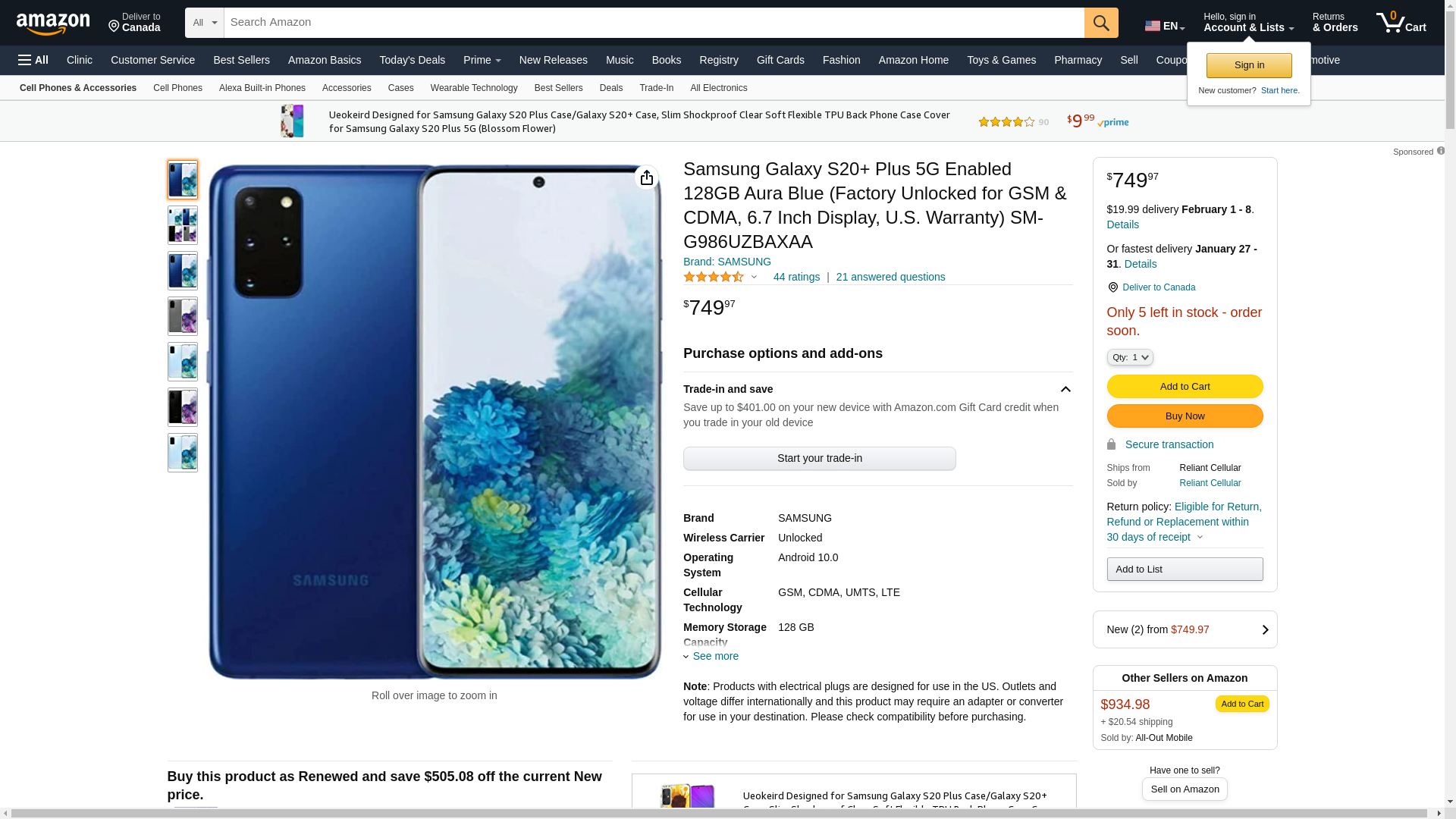 Samsung Galaxy S20+ Plus 5G Enabled 128GB Aura Blue (Factory Unlocked for GSM & CDMA, 6.7 Inch Display, U.S. Warranty) SM-G986UZBAXAA