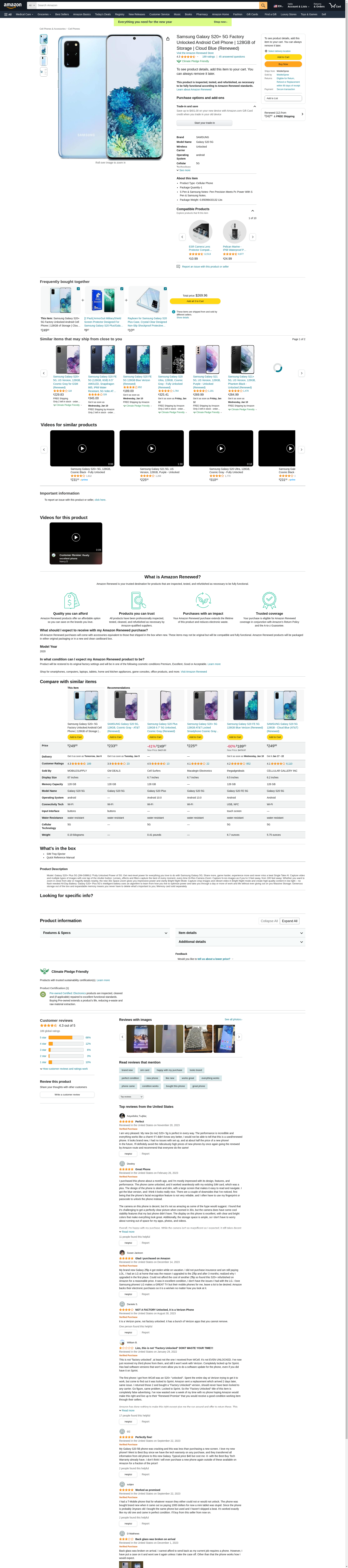 Samsung Galaxy S20+ 5G Factory Unlocked Android Cell Phone | 128GB of Storage | Cloud Blue (Renewed)