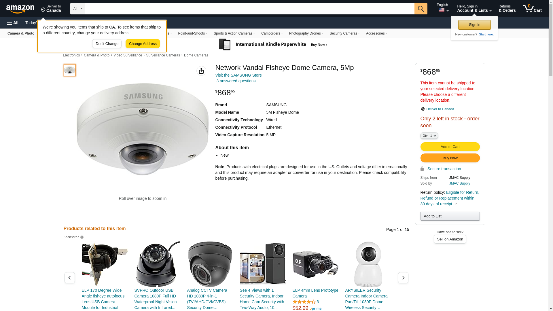 IP Camera, Fisheye, 5-47/64inLx5-47/64inW