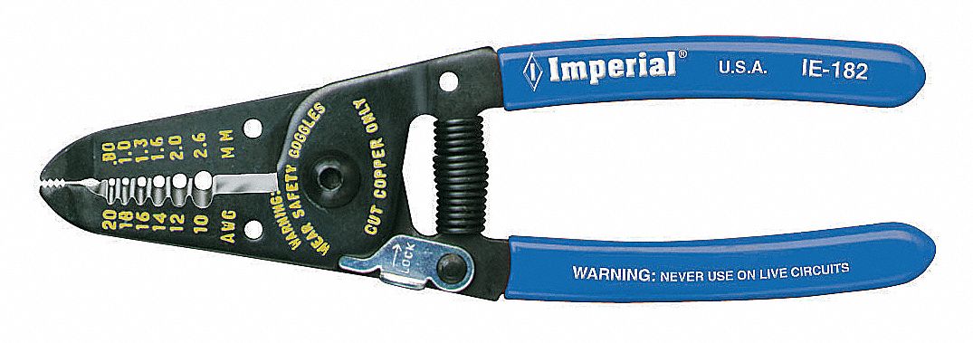 | Feature | <b>Price For:</b> Each <b>Item</b>: Wire Stripper <b>Tether Capable</b>: Standard Tool (Accessory Needed for Tethering) <b>Insulated</b>: No <b>Handle Material</b>: Hardened Steel <b>Standards</b>: ASME B107.500-2010 <b>Features</b>: Precision Ground Stripping Stations, Serrated Pliers Nose, Return Spring and Lock <b>Functions</b>: Strip/Cut <b>Overall Length</b>: 6" <b>Cable Type</b>: Stranded <b>Adjustable</b>: NO <b>Handle Type</b>: Cushion Grip with Lock |
