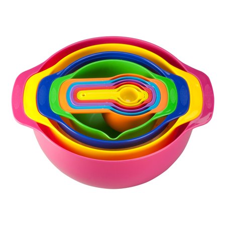 Nesting neatly for easy storage, this 10-pc. set of nested mixing bowls works countless ways ... for one value price! Mixing, serving, straining, measuring and more, the bright prep set includes pink mixing bowl (20 cups or 5 quarts), green kitchen bowl (3 cups), yellow colander (9"dia.), blue sieve (7 1/2"dia.) and 6 measuring cups/spoons (7.5 ml, 15 ml, 60 ml, 85 ml, 125 ml, 250ml in various color assortments; we'll choose). All 10 pieces are designed in durable plastic and dishwasher safe. Not recommended for microwave use.
