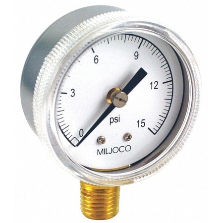 Pressure Gauge, 2 In, Lower, 0 to 15 psi