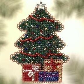 Gifts Galore Christmas Tree - Winter Holiday 2005 - Mill Hill Counted Glass Bead Christmas Ornament Kit with Treasure H126. This delightful beaded Gifts Galore Christmas Tree can be used as a charming ornament or a lovely brooch. Kit makes one counted glass bead cross stitch Gifts Galore Christmas Tree ornament or pin. Finished Size: 2 x 2.5 inches (5.08 x 6.35 cm).