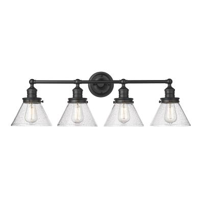 Modern farmhouse design is taken to the next level with the Eyden Collection of vanity lighting. Available in brushed nickel, black matte, or modern gold, the classic hardware design is further enhanced by clear, seedy-glass conical shades. Place this fixture directly above the mirror and sink to add the perfect lighting to your bathroom. / Constructed from metal / 1 Year limited manufacturer's warranty / This fixture must be hardwired / Rated for damp location / Compatible with standard wall dimmer / Professional installation recommended..