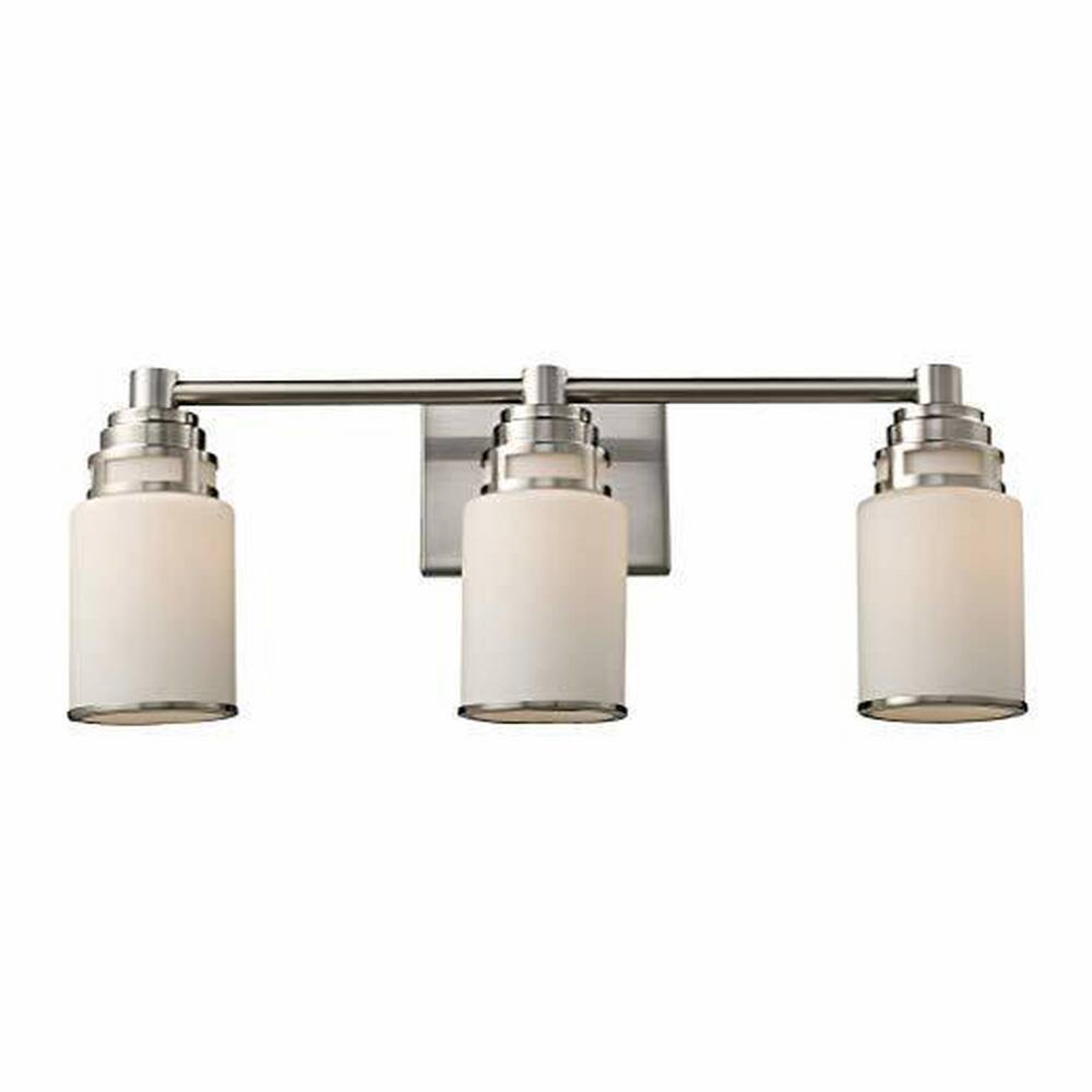 A vanity collection with clean straight lines which offers a more contemporary style. Satin nickel bar with faux alabaster glass shades to illuminate the lighting.