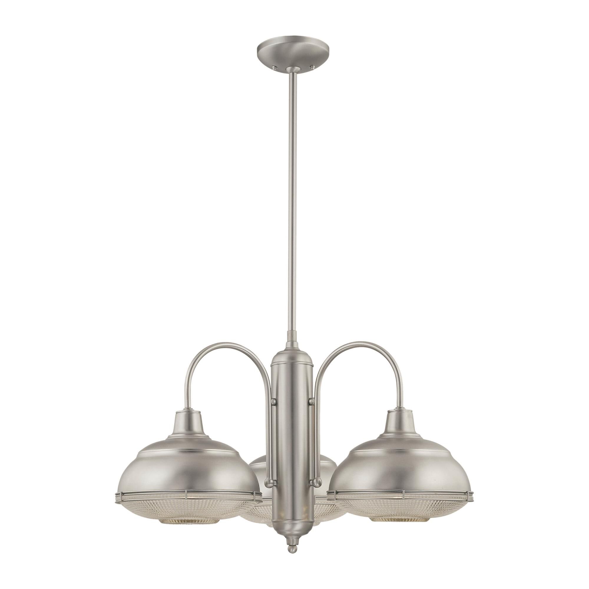 Finish:Satin Nickel, Glass:Clear Crosscut, Light Bulb:(3)100w A19 Med F Incand Neo-Industrial three-light chandelier.Features a ball-mount hanging system that can swivel up to 60Includes 6', 12', and 18' stems (one each)Can be installed semi-flush (without stems)Can use up to two (2) additional 12' stems (sold separately)