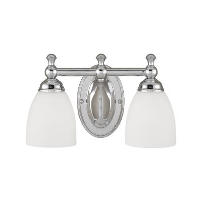622-CH Finish: Chrome Features: -Bath vanity light.-Number of lights: 2.-Shade material: Etched white glass.-Damp location.-UL listed.-Extension: 7". Specifications: -Bulb type: 200W A19 medium incandescent bulb. Dimensions: -Overall dimensions: 8" H x 13" W.