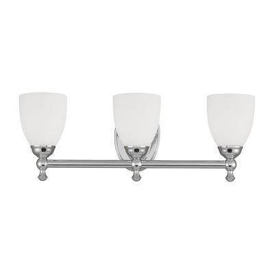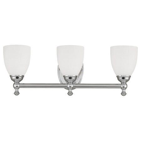 623-CH Finish: Chrome Features: -Bath vanity light.-Number of lights: 3.-Shade material: Etched white glass.-Damp location.-UL listed.-Extension: 7". Specifications: -Bulb type: 300W A19 medium incandescent bulb. Dimensions: -Overall dimensions: 8" H x 21.5" W.