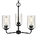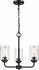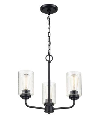Collection: Moven, Finish Color: Matte Black, Width: 18", Height: 16", Chain Length: 60", Number Of Bulbs: 3, Wattage: 100 Watts, Moisture Rating: Dry Rated, Desc: The Moven Collection elevates bold simplicity to a whole new level of design. Strong, elegant lines are set against handcrafted style seeded glass, creating an overall effect that is both rened and striking. The collection is available in either matte black or satin nickel nish. Bulbs must be purchased separately. Place this fixture to the side of your kitchen, bathroom, bedroom, foyer or any room to accent your decor. Compatible with standard wall dimmer 1 year limited manufacture's warranty This item is UL listed Meets CSA standards This item is rated for dry location. Professional installation recommended. 1 Year LimitedCanopy Included: Yes / Shade Included: Yes / Canopy Diameter: 5 x 1. Chain Length: 60.00. ,