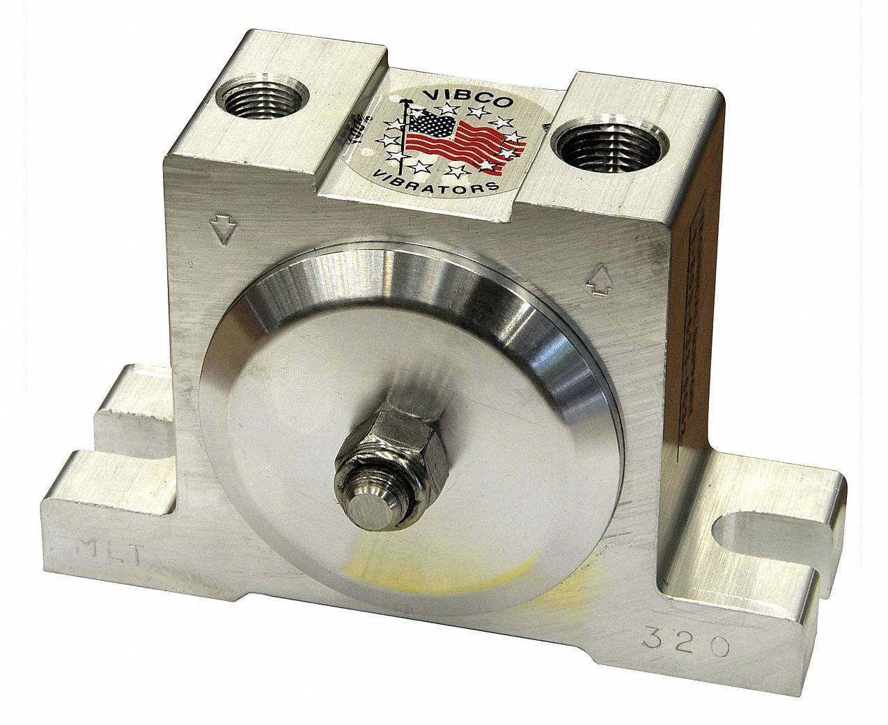 Pneumatic Vibrator, Housing Material Aluminum, Outlet Connection Size 1/2 in, Outlet Connection Type NPT, Air Flow Rate 10 cfm @ 80 psi, 9 cfm @ 60 psi, Maximum Force 600 lbf, Inlet Connection Size 3/8 in, Inlet Connection Type NPT, Maximum Vibration Speed 5,000 vpm, Maximum Bin Weight Capacity 6,000 lb, Overall Height 4.25 in, Overall Length 6.38 in, Overall Width 4.02 in, Sound Level 70 dBA, Duty Cycle Continuous, Pneumatic Vibrator Type Turbine, Force @ PSI 510 lbf @ 60 psi, 600 lbf @ 80 psi