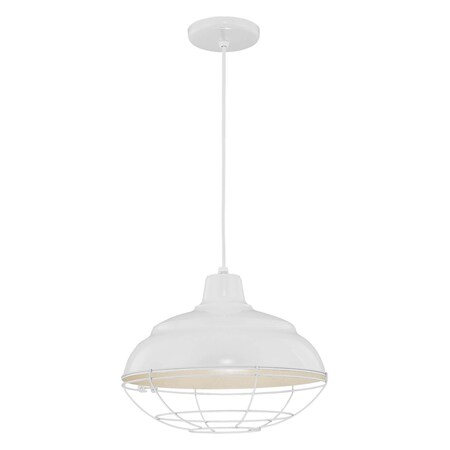 RWHC14-WH Size: 8.25" H x 14" W, Finish: White Features: -Pendant.-Number of lights: 1.-Warehouse / cord hung.-Damp location.-UL listed.-UV protectant clearcoat. Includes: -Includes canopy and 12'' cord. Specifications: -Bulb type: 200W A19 medium incandescent bulb. Dimensions: -9.25'' H x 17'' W. Collection: -R Series collection. Shown with optional Wire Guard (RWG14-WH).