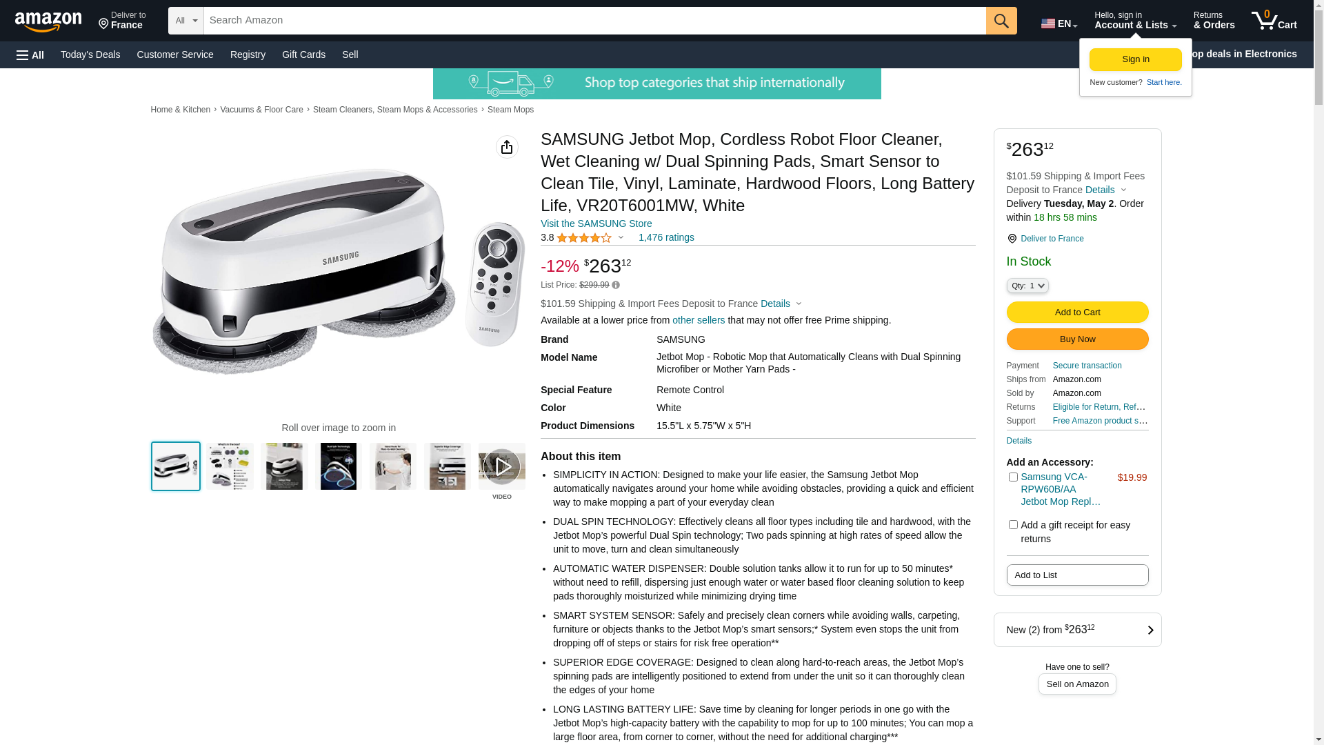 Samsung Electronics VR20T6001MW/AA Samsung Jetbot Robotic Cleans with Dual Spinning Microfiber Pads | Smart Sensor Wet Mopping Perfect for Tile, Vinyl, Laminate, and Hardwood, White