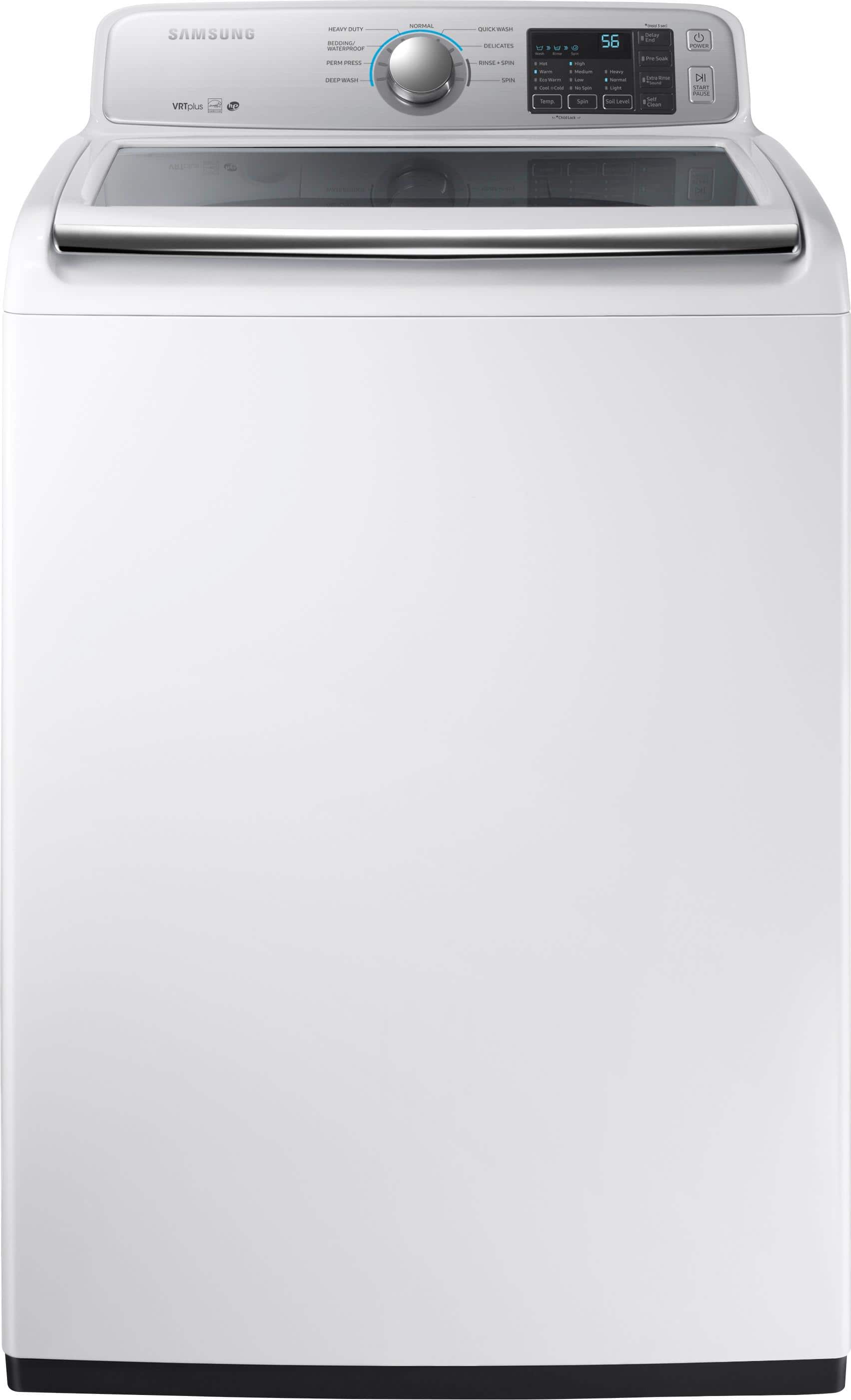 Samsung's Top Load Washer with 4.5 cu. ft. capacity allows for larger loads so you can spend less time doing laundry. Vibration Reduction Technology keeps loads balanced and quiet even at high speeds. Self-Clean keeps your laundry drum fresh and odor-free so it’s ready for the next wash.