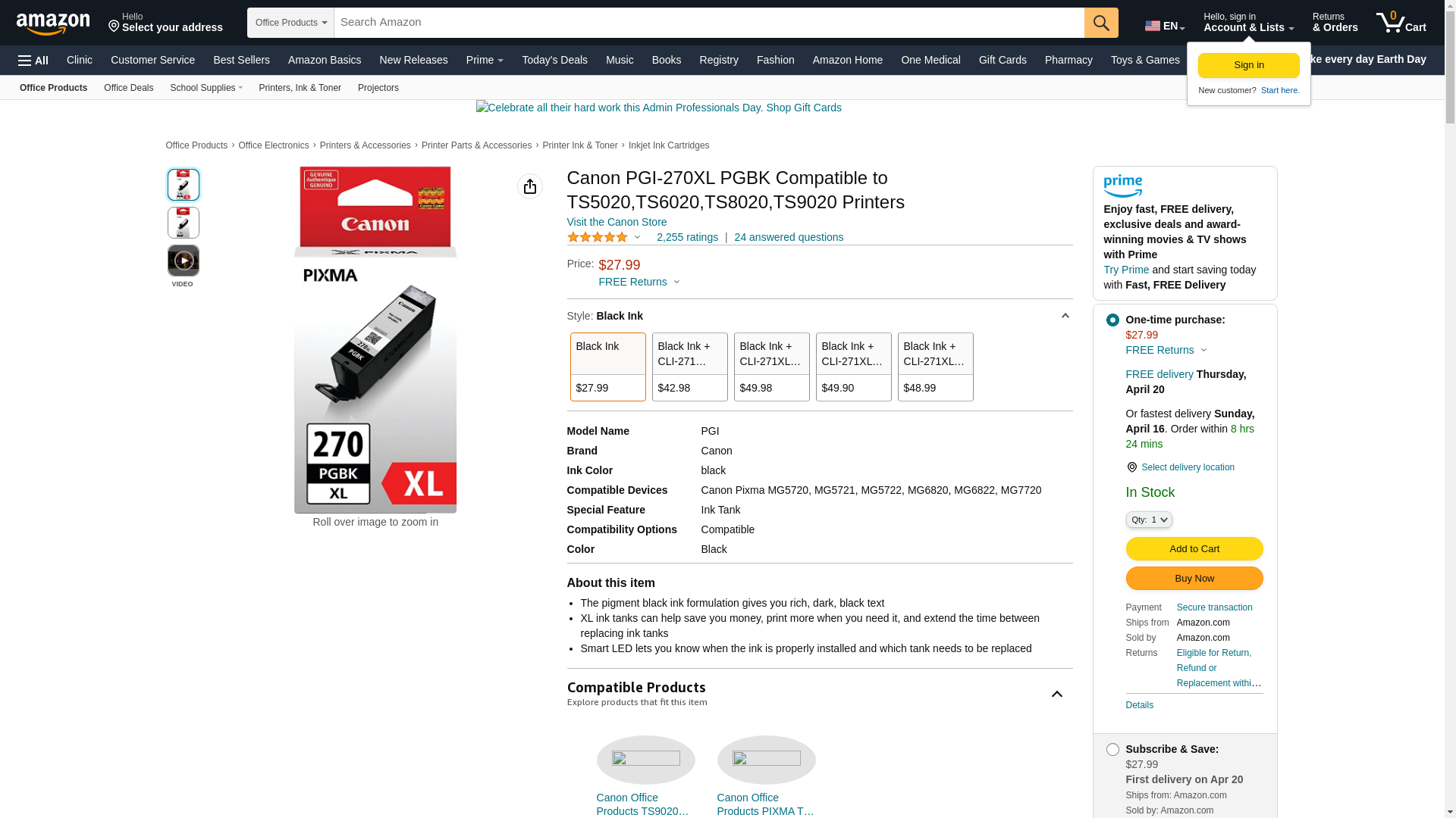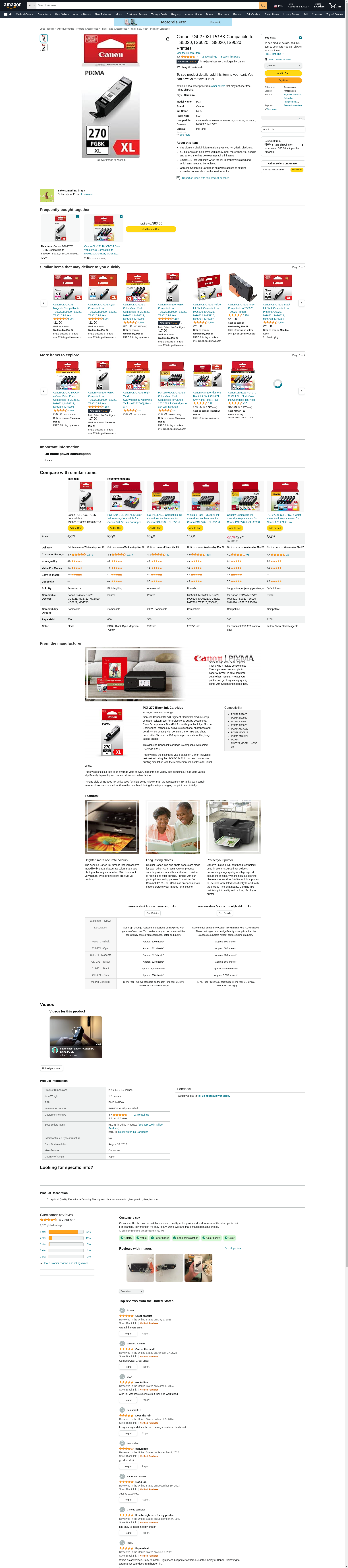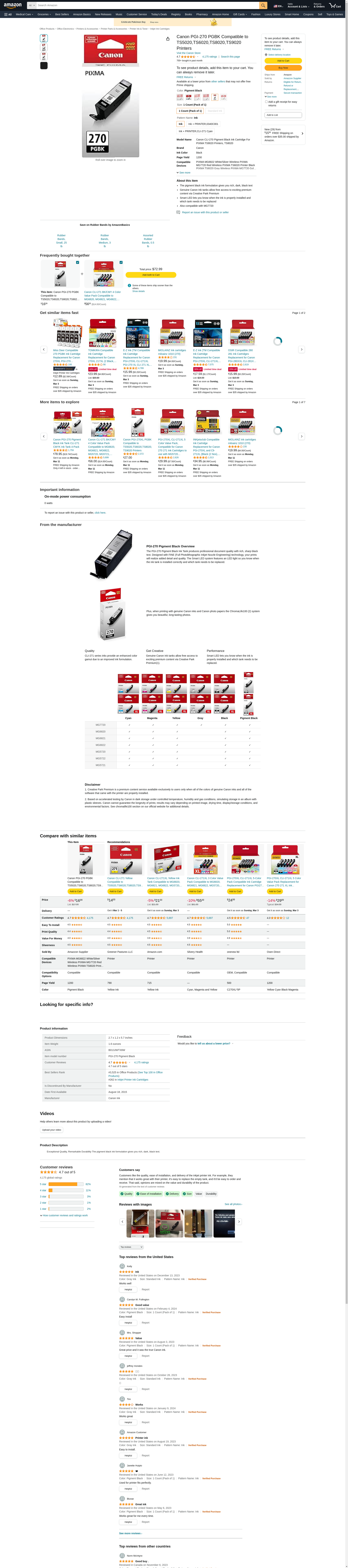 Canon PIXMA 270 PGBK XL MG5721 High Yield Pigment Black with 271 4-Color (BK/C/M/Y) Ink 5-Pack