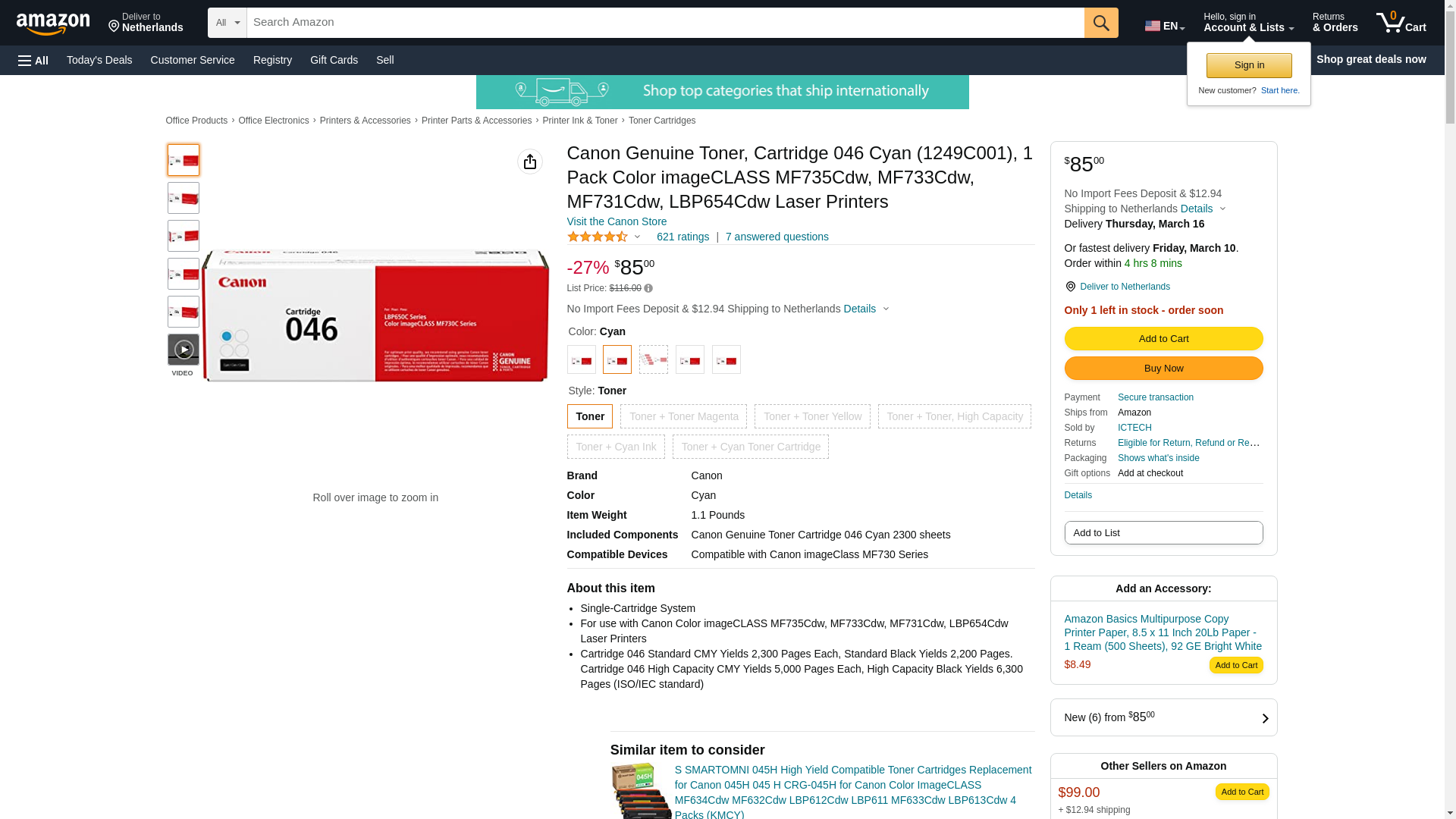 Canon Genuine Toner, Cartridge 046 Cyan (1249C001), 1 Pack, for Canon Color imageCLASS MF735Cdw, MF733Cdw, MF731Cdw, LBP654Cdw Laser Printers