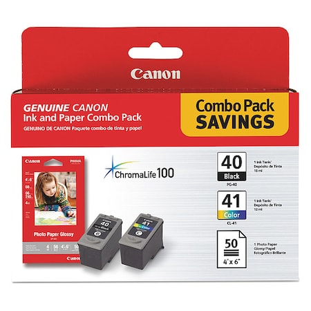 glossy Photo Paper Combo Pack Includes One Pg-40 Black, Cl-41 Color And One Photo Paper Glossy 4 X 6 (50 Pk). Components Are Designed For Use With Canon Pixma Ip1600 Photo Printer, Pixma Mp150, Mp160, Mp170, Mp180, Mp450 And Mp460 Photo All-in-one. Pg-40 Black Ink Cartridge Offers Genuine Canon Ink For Quality And Reliability. Ink Resists Smearing Caused By Highlighters. Black Ink Cartridge Is Smudge-resistant And Offers Pigment Ink Formulation For Long-lasting Prints. Cl-41 Color Ink Tank Offers Genuine Canon Ink For Quality And Reliability As Well As The Chromalife100 System To Create Long-lasting, Beautiful Photos When Used With Genuine Canon Photo Paper.