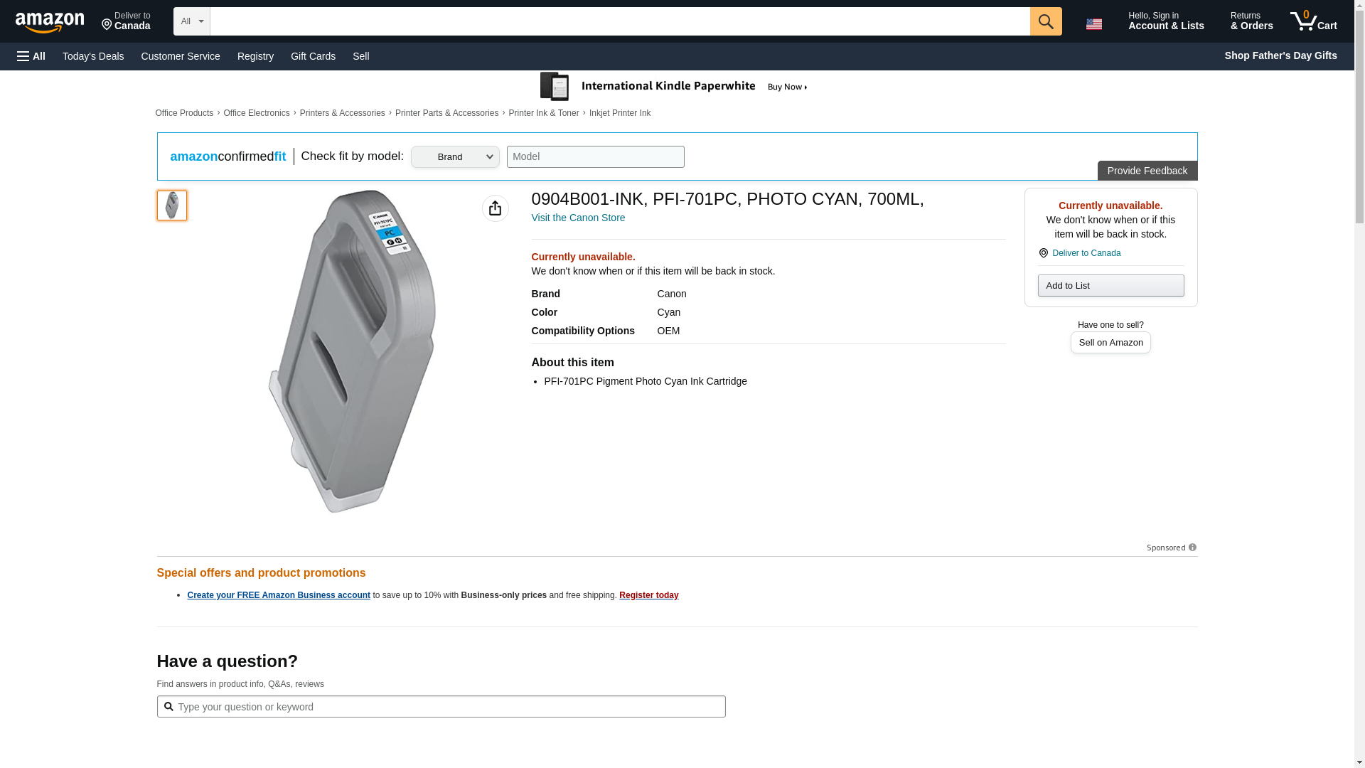 | Feature | Canon 0904B001 INK, PFI-701PC, PHOTO CYAN, 700ML, (0904B001) |