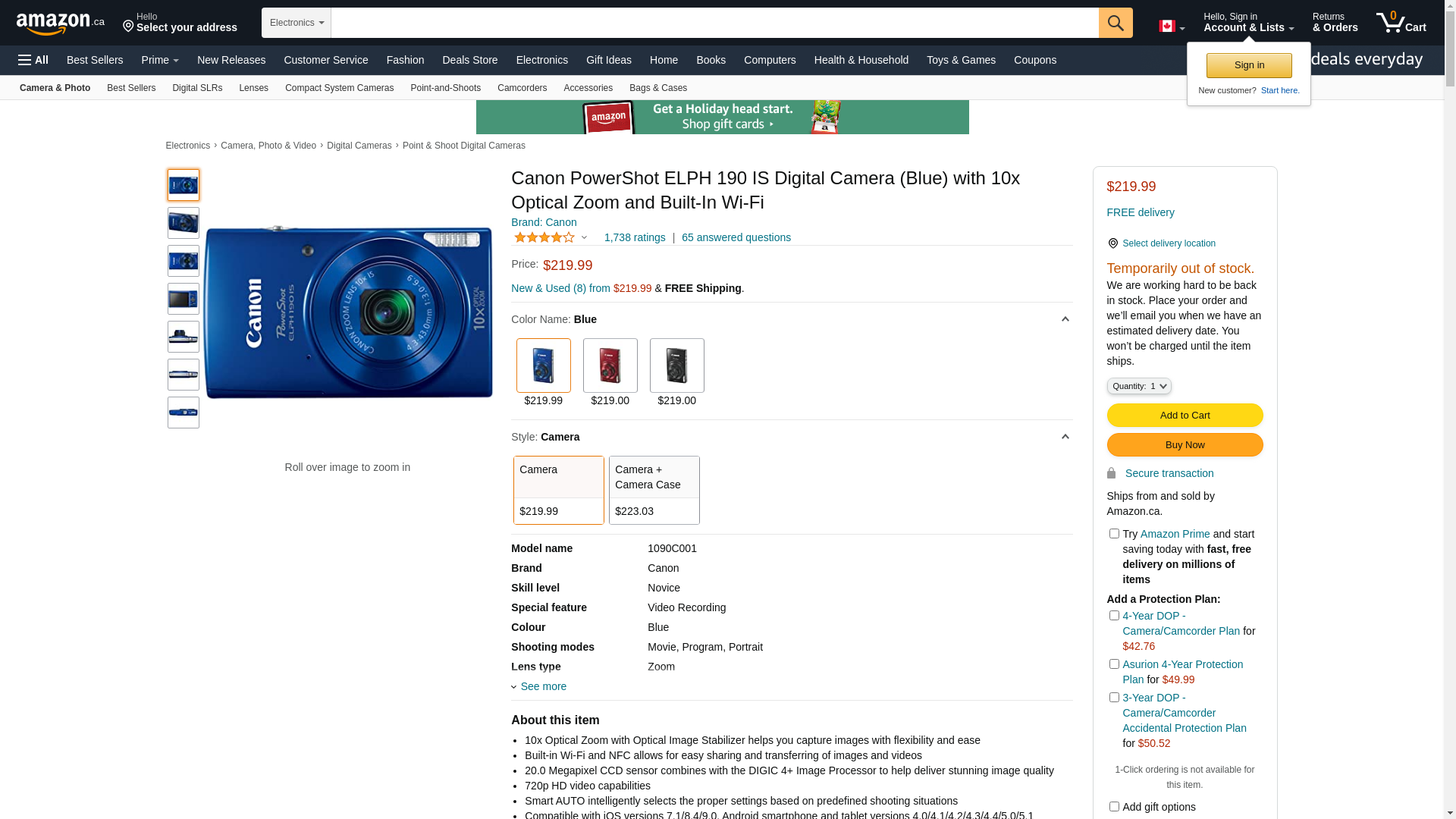 Canon PowerShot ELPH 190 Digital Camera w/10x Optical Zoom and Image Stabilization - Wi-Fi & NFC Enabled (Blue)