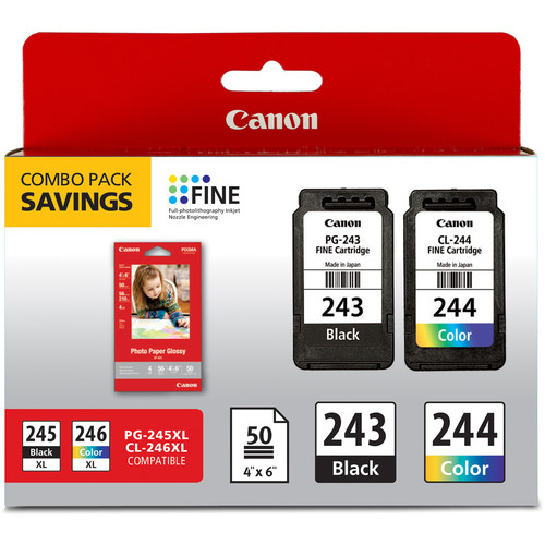 | Feature | PG-243 Black Ink Cartridge - CL-244 Color Ink Cartridge - GP-601 Photo Paper (50 Sheets of 4x6") |