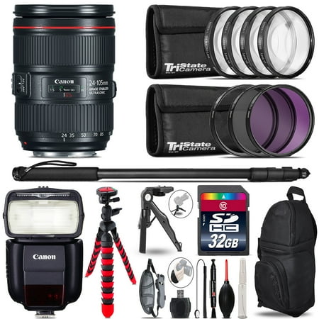 - Bundle Items Includes: 1 x Canon EF 24-105mm f/4L IS II USM Lens, 1 x 77mm 3 Piece Filter Kit, 1 x Pro Sling Backpack, 1 x SanDisk 64GB Ultra SDXC Memory Card, 1 x Memory Card Reader, 1 x 12_inch Flexible Tripod, 1 x Memory Card Wallet, 1 x Lens Cap Keeper, 1 x Cleaning Kit, 1 x Hand Strap