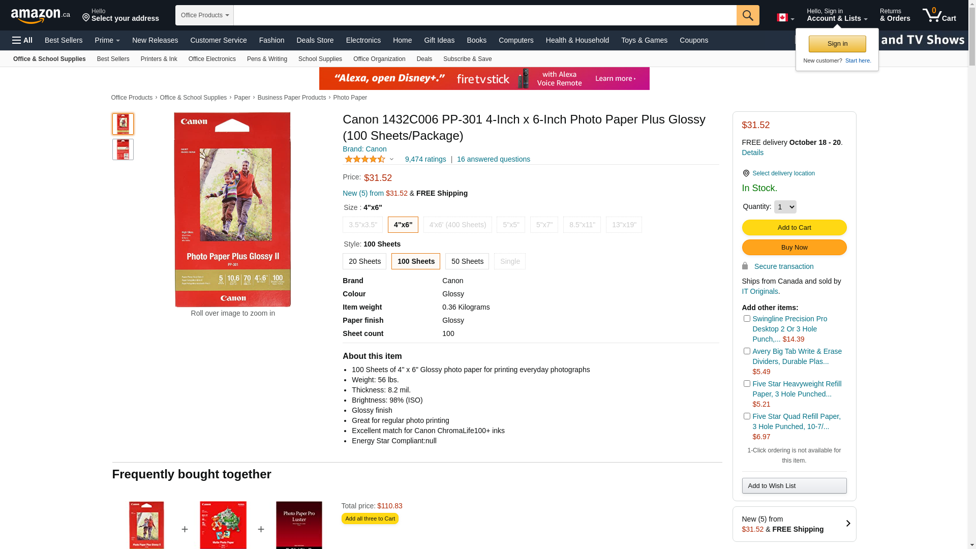 Canon 4x6'' Photo Paper Plus Glossy II 1432C006 (3 Pack, 300 Sheets)
