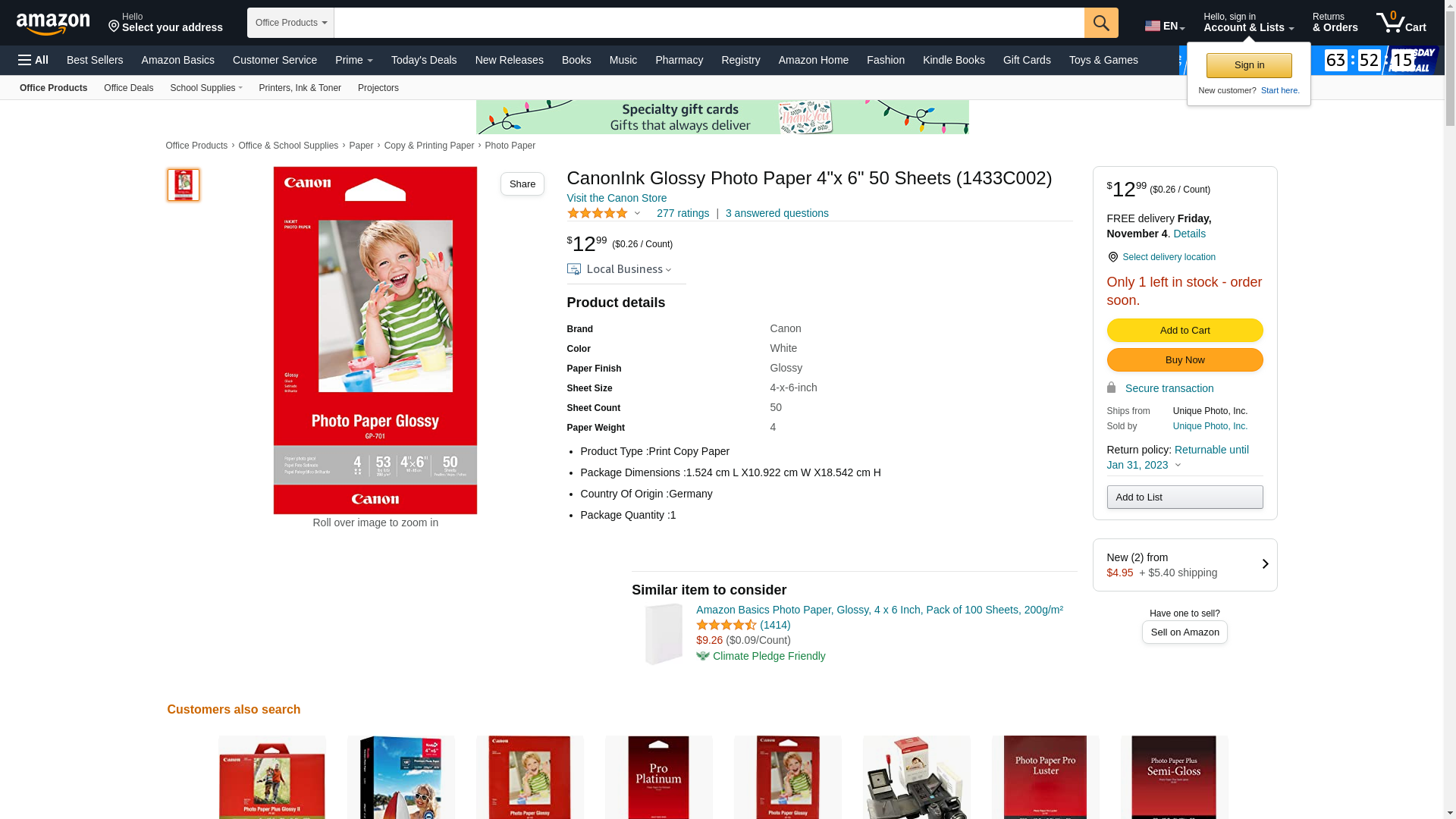 CanonInk Glossy Photo Paper 4"x 6" 50 Sheets (1433C002)