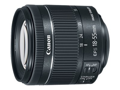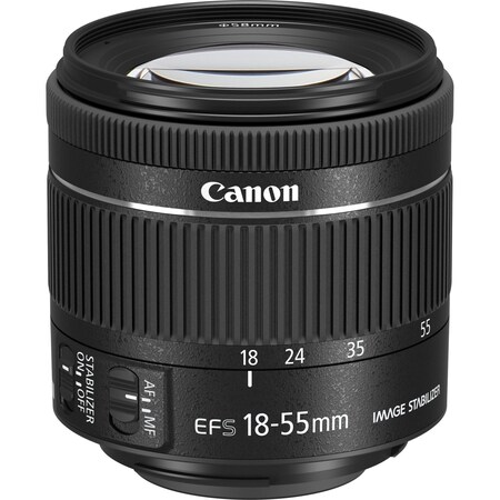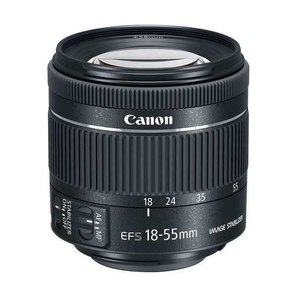 - A versatile standard zoom for Canon APS-C-format DSLRs, the EF-S 18-55mm f/4-5.6 IS STM Lens is a sleek and flexible option for everyday shooting. Spanning a 28.8-88mm equivalent focal length range, this lens covers wide-angle to portrait-length perspectives, and features an Optical Image Stabilizer to minimize the appearance of camera shake by up to four stops for sharper handheld shooting. One aspherical element is featured in the optical design to improve sharpness and resolution.